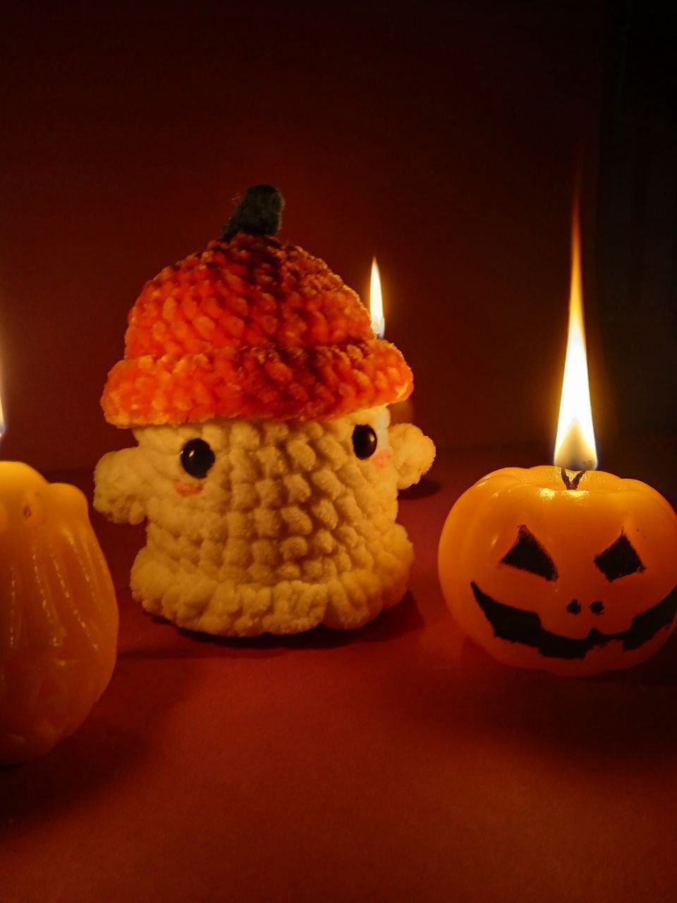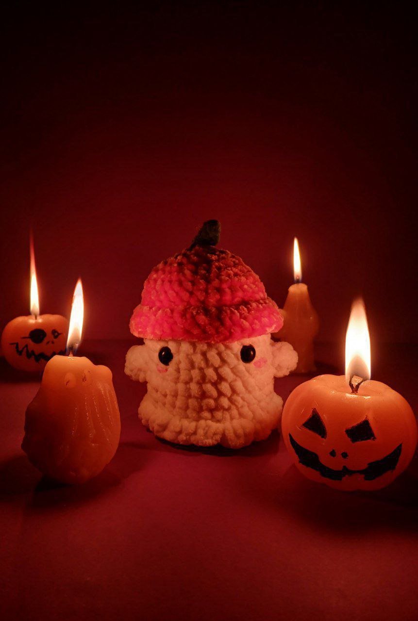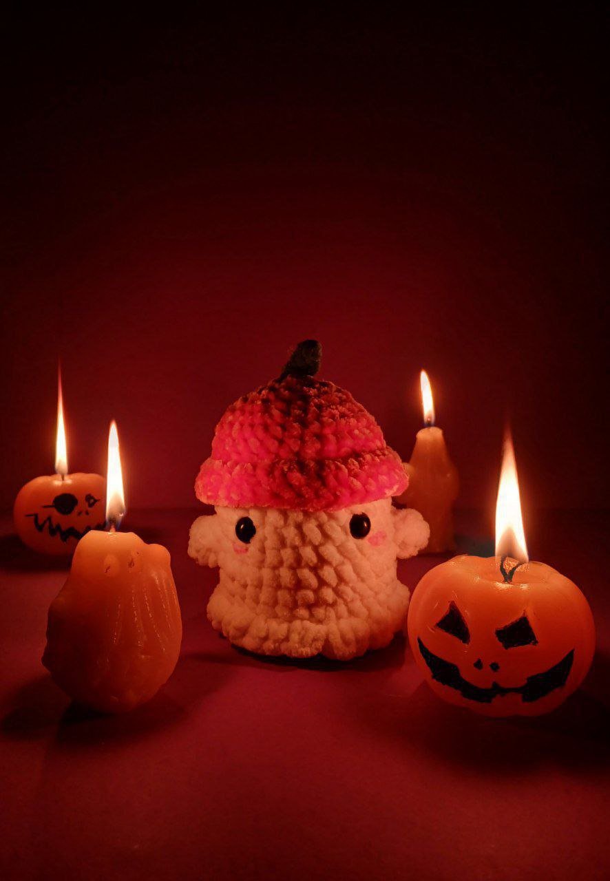 Um fantasma tímido com o seu fato de Halloween (um chapéu de abóbora) feita à mão com fios de pelúcia.