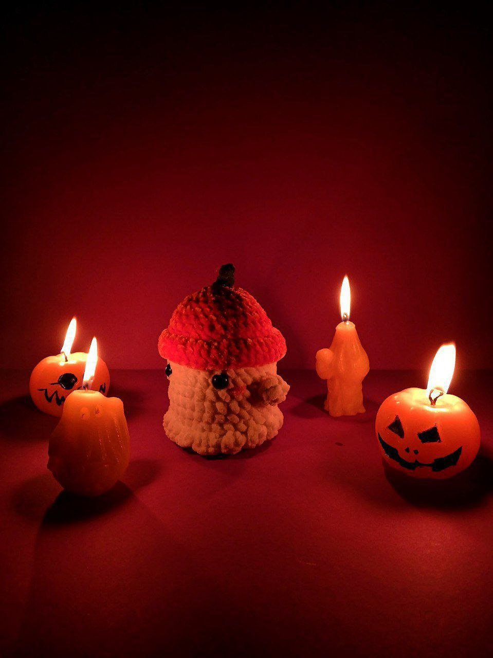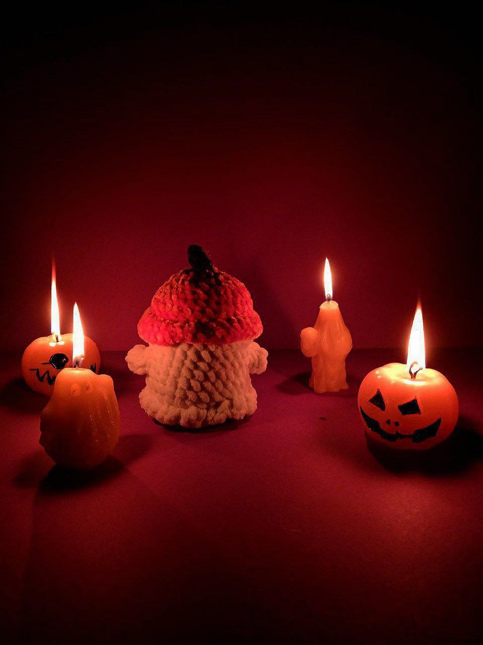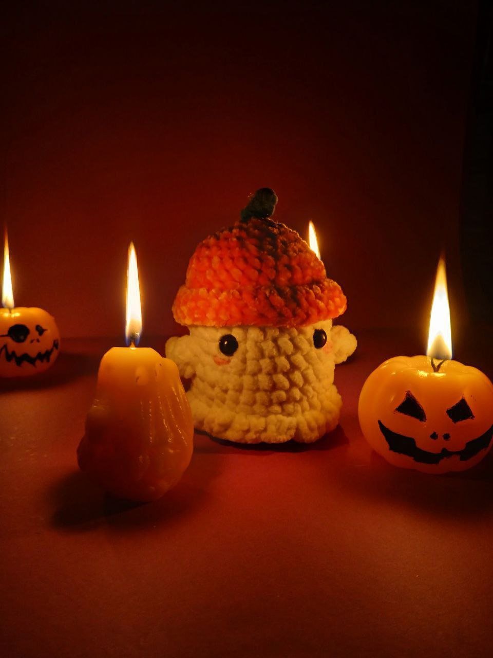 Um fantasma tímido com o seu fato de Halloween (um chapéu de abóbora) feita à mão com fios de pelúcia.
